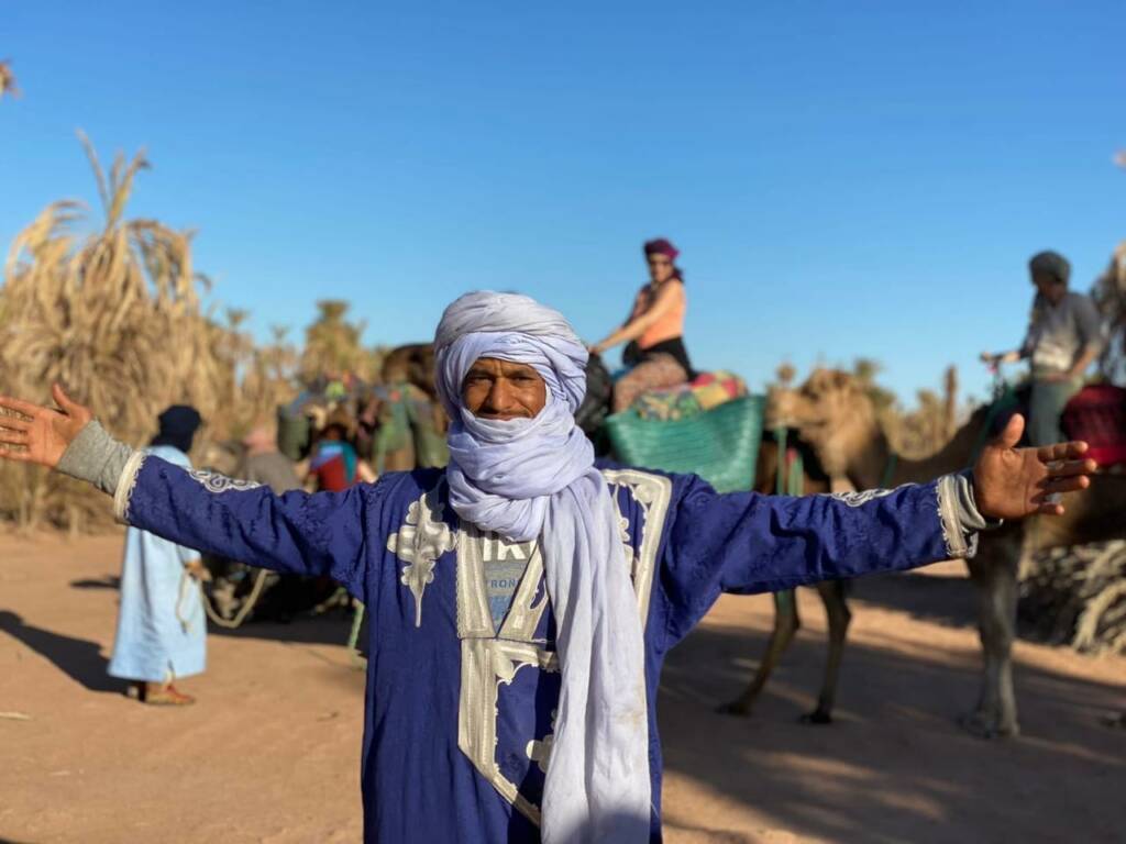 À ses côtés, Esmail Boudani, cuisinier et chamelier, et Ahmed, un habitant bédouin de la tribu Aarib, vous partagent leur savoir-faire et leur amour du désert. Tous deux issus de familles nomades, ils ont grandi entourés de troupeaux de dromadaires et connaissent le désert comme personne. Leur expérience vous garantit une immersion authentique dans la culture et les traditions ancestrales du sud marocain.